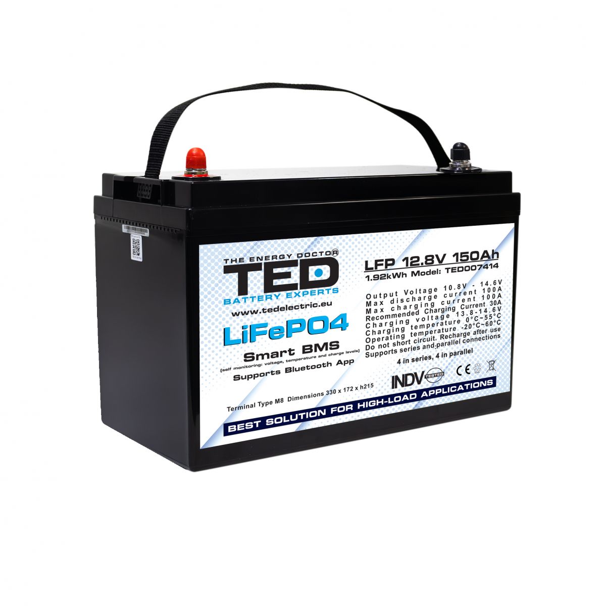 Specificatii tehnice acumulator LiFePo4 12.8V 150Ah, BMS, bluetooth, M8 TED Electric – TED007414: