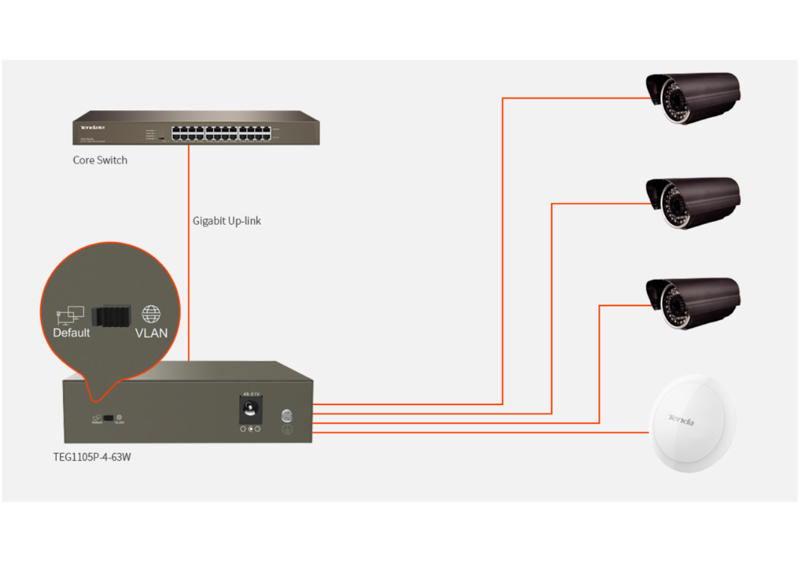 TEG1105P-4-63W este un switch PoE performant, echipat cu 5 porturi RJ45 cu viteze de 10/100/1000 Mbps. Porturile 1-4 sunt compatibile cu standardele IEEE 802.3af, oferind o putere PoE maxima de 15, 4W per port, si IEEE 802.3at, cu o putere PoE maxima de 30W per port.